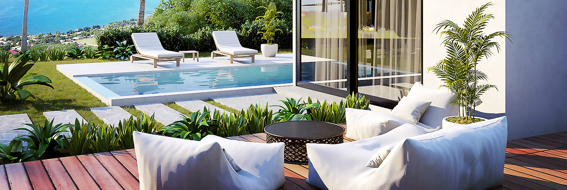 Surrounded by lush tropical gardens and lovely sea views, these spacious three-level, two-bedroom villas are perfect for families or couples. These charming Villas are surrounded by lush tropical gardens and lovely sea views.